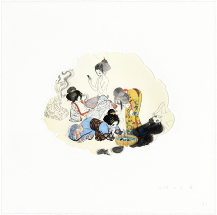 This colorful and delicate etching was printed by the five cloud-shaped copper plates. You would feel as if you were looking a scean inside room through a Japanese traditional decolated window.